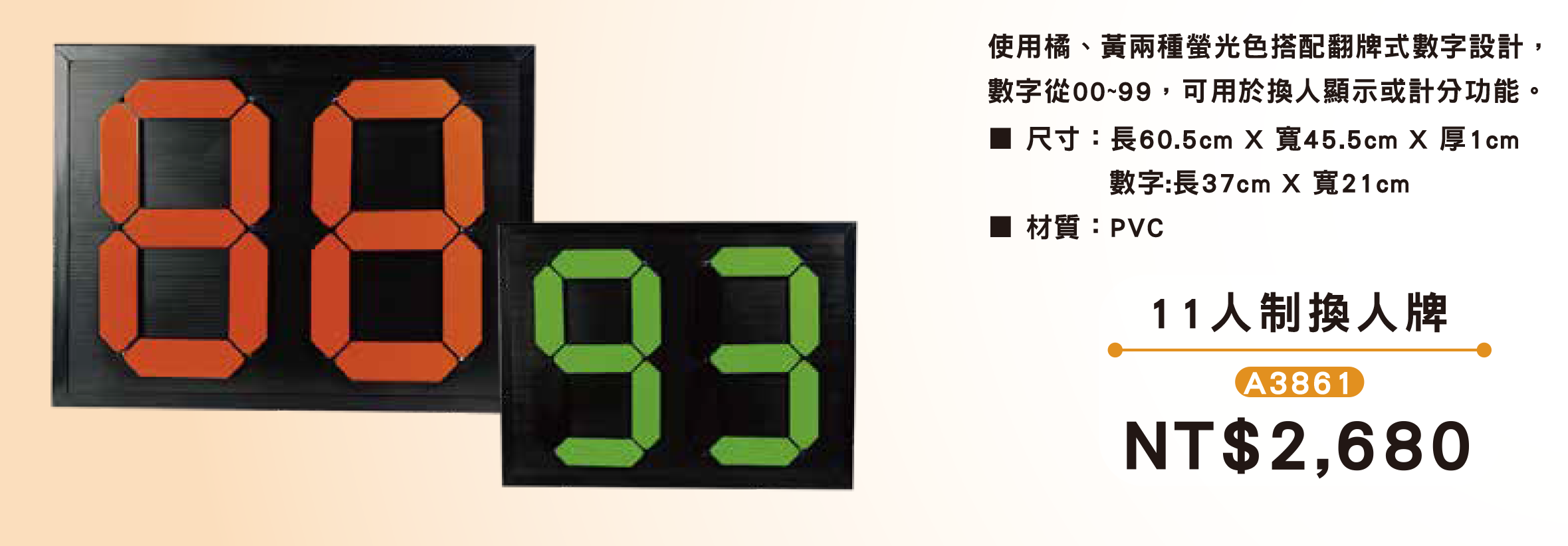 | ◆使用橘、黃兩種螢光色搭配翻牌式數字設計 ◆數字從00~99,可用於換人顯示或計分功能